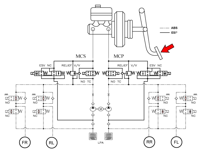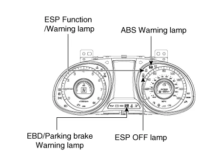 After the key-on, the ECU continually diagnoses the system failure. (self-diagnosis)If the system failure is detected, the ECU informs driver of the system failure through the BRAKE/ABS/ESP warning lamp. (fail-safe warning)