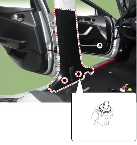 Remove the rear door scuff trim (A) after loosening the mounting clip.