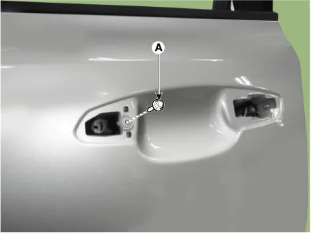 Loosen the front door outside handle base mounting screw (A).