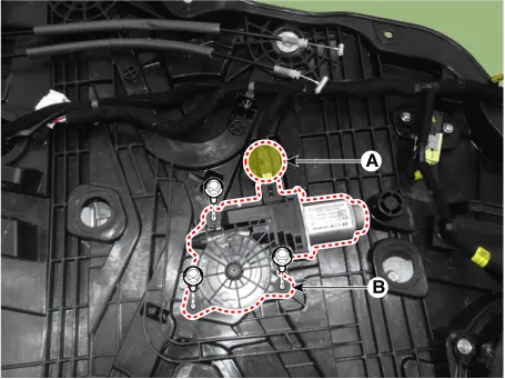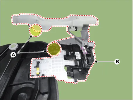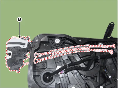 Remove the front door power window motor (B) after disconnecting the connector (A).