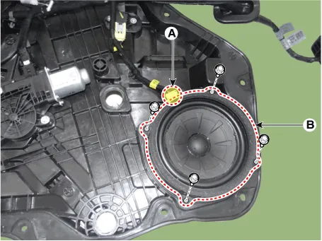 Remove the front door speaker (B) after disconnecting the connector (A).