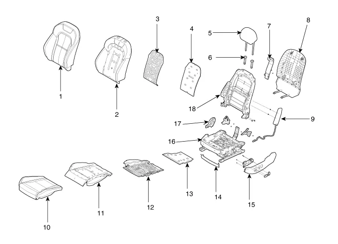 11. Front seat cushion pad 12. Front seat cushion heater 13. Front seat cushion air ventilation mat 14. Front seat shield center cover 15. Front seat shield outer cover 16. Front seat cushion frame 17. Front seat shield inner cover 18. Front seat back frame |