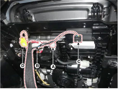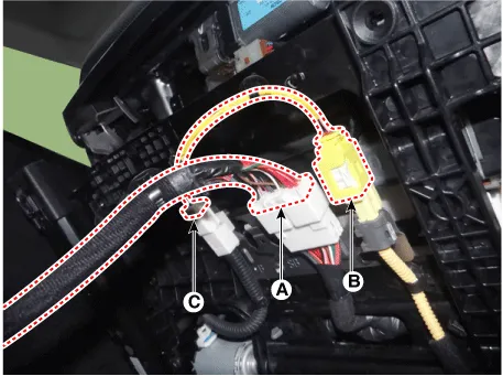 Disconnect the main connector (A), side airbag connector (B), and front seat belt buckle connector (C). [Driver Side]