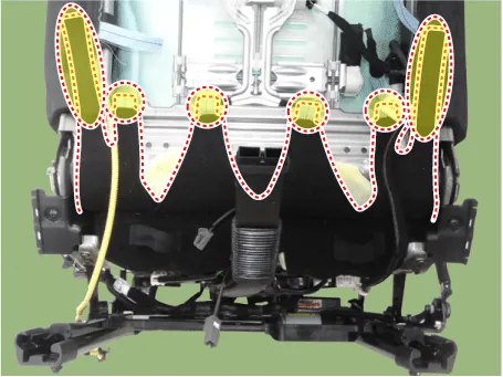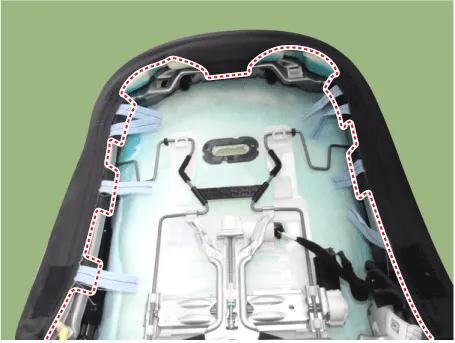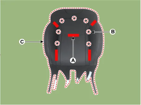 Remove the front seat back covering (C) from the front the seat back frame after removing the velcro tape (A) and hog-ring clips (B).