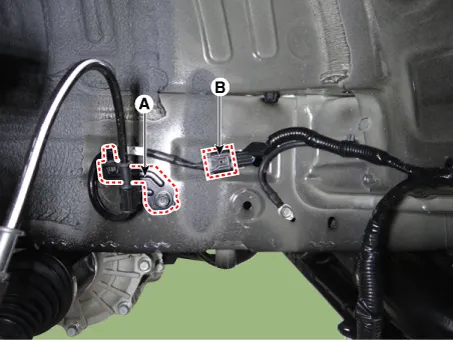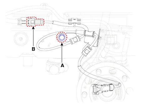 Loosen the wheel speed sensor bracket bolt (A), and then disconnect the wheel speed sensor connector (B).