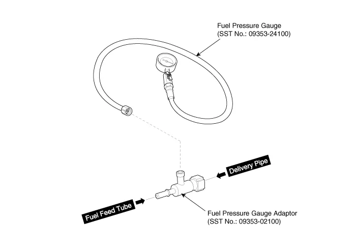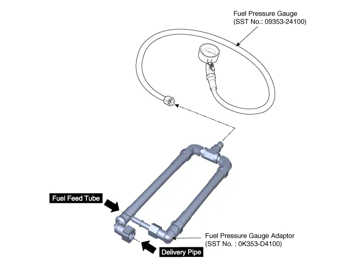 Check for fuel leakage from connections on the low fuel feed tube, the low pressure inlet of high pressure fuel pump, and the SST components with ignition "ON". |