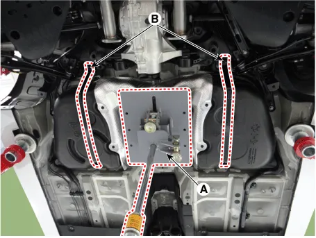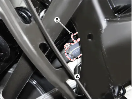 Remove the fuel tank installation nut (B) and then loosen the fuel tank.