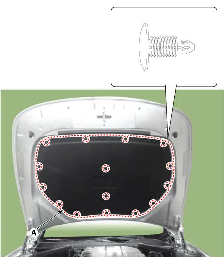 Using a clip remover, detach the clips, and remove the hood insulator pad (A).
