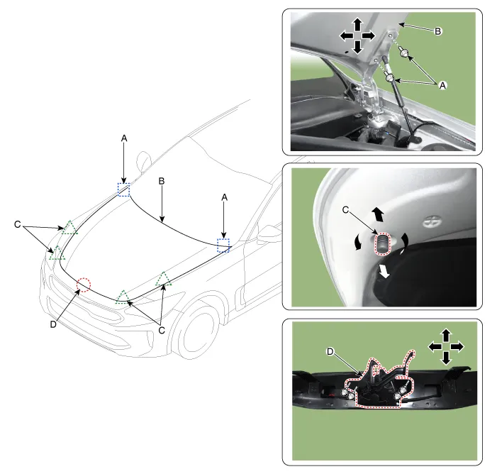 After loosening the hood latch (D) mounting bolts, adjust the latch by moving it up and down, or right and left.