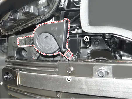 After loosening each mounting bolt of the low-pitch horn (A) and high-pitch horn (B), detach the connector (C) and remove the horn. [Low - Pitch Horn]