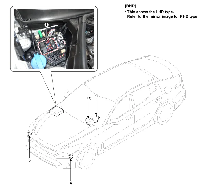 | 1. Horn switch 2. Horn relay (Built - in Metal Core Block PCB) 3. Horn (Low pitch) |