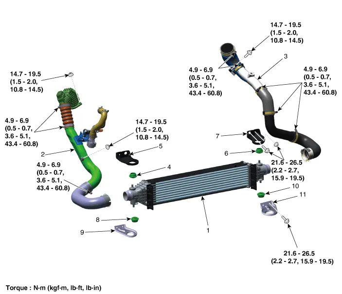 bracket (LH) 8. Intercooler lower mounting insulator (RH) 9. Intercooler lower mounting bracket (RH) 10. Intercooler lower mounting insulator (LH) 11. Intercooler lower mounting bracket (LH) |
