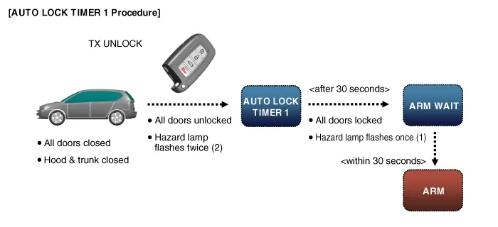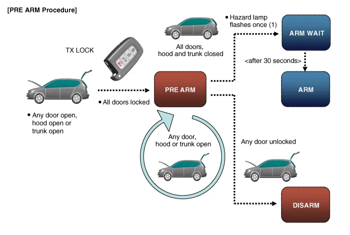 Timer 2 is completed and all doors are closed. 1-2. If the driver closes hood or tailgate, hazard lamp blinks one time and then the vehicle automatically enters "ARM" mode via "ARM WAIT" mode. 2-1. If LOCK button is pressed while at least one of all doors, hood and tailgate is open, "PRE ARM" mode turns on. 2-2. Because all doors locking signal is issued but the conditions for "ARM WAIT" are not satisfied, the vehicle remains in standby mode and enters ARM mode via ARM WAIT mode as soon as the door being open is closed. 2-3. In case intrusion is detected in PRE ARM mode, the vehicle turns into DISARM mode. 2-4. Security indicator keeps blinking in PRE ARM mode. |