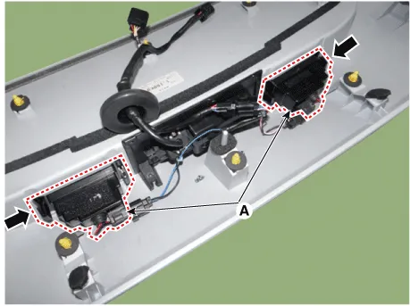 Components and components location Components Repair procedures Inspection 1. Disconnect the negative (-) battery terminal. 2. Remove the overhead console lamp (A) after loosening the mounting screws. 3. Disconnect the overhead console lamp connectors (A).