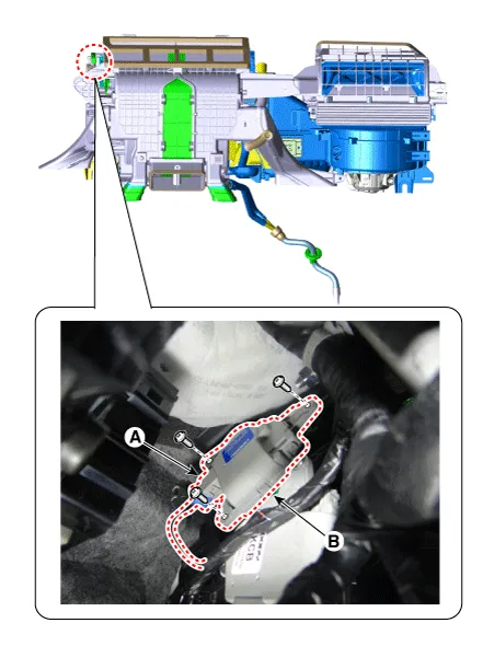 Disconnect the connector (A) and then remove the mode control actuator (B) after loosening the screws.