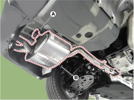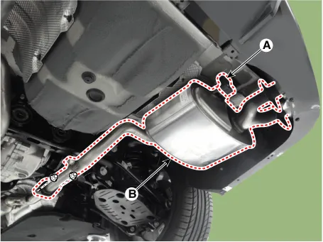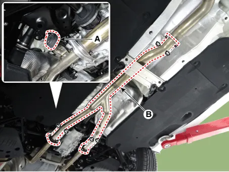 Remove the LH rear muffler (B).