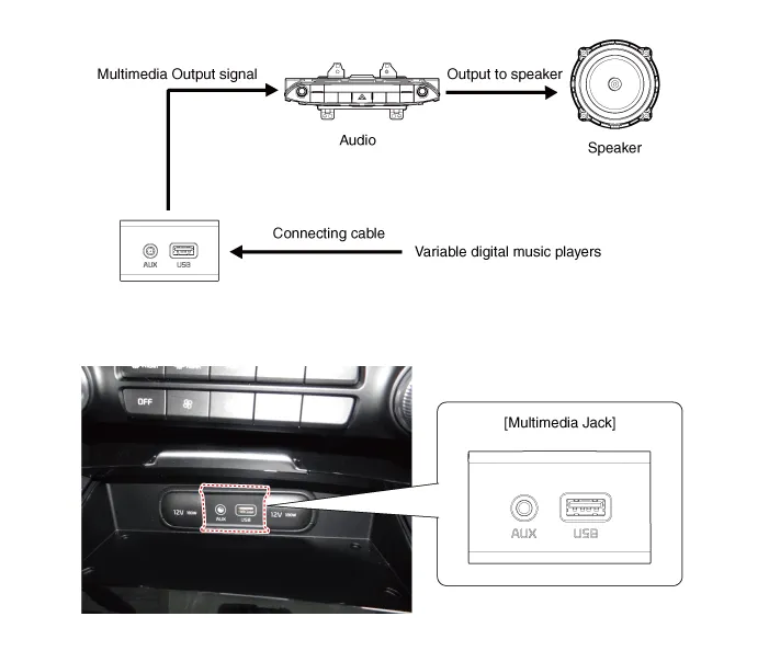 The multimedia jack on the console upper cover is for customers who like to listen to external portable music players like the MP3 etc., through the vehicle's sound system when it is linked to this jack. The customer has this added option.