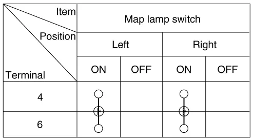 Remove the overhead console lamp assembly then check for continuity between terminals. If the continuity is not as specified, replace the map lamp switch.