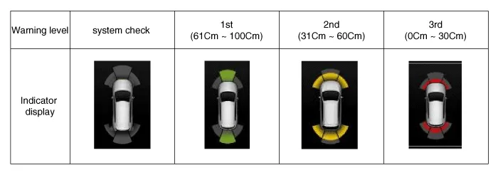 Alarm level per distance - Front, Rear sensor When the gear is applied to R, cluster lights the indicator as below figure.When the system finds an object, it lights indicator immediately. During sensing an object, if there is no object, it lights indicator that is no alarm status for two seconds and then turns out afterward detecting an object. (But when it turns third step alarm to No alarm status, it lights third step alarm for two second and turns out.)