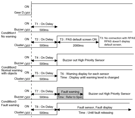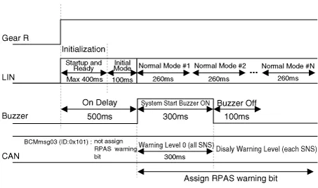 When the system has the power (after IGN ON and R gear), MICOM checks every sensor channel.In case it is not find any error, it sounds 300ms buzzer 500ms afterward.But it finds any error even a sensor, it sounds buzzer corresponding fault sensor instead of initial starting alarm. Function for normal mode entrance is as below