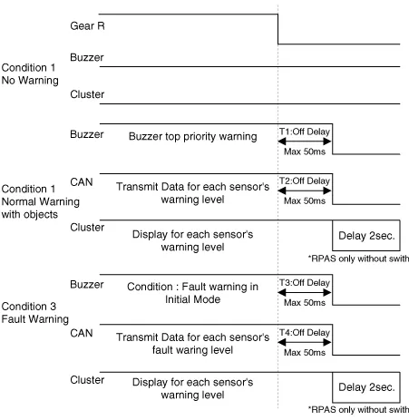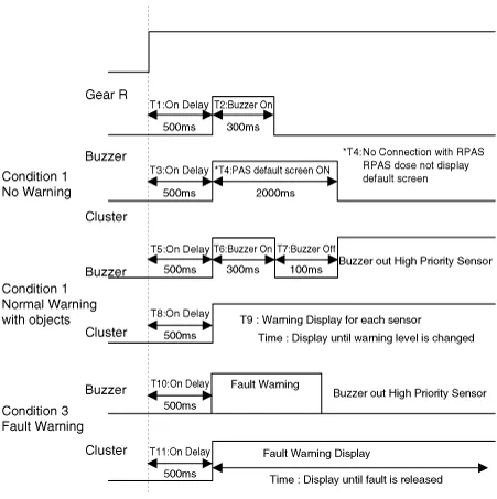 When the PDW-R sensor detects the object, warning is operated by audible alarm device as like buzzer. PDW-R sensor sends data to IBU with LIN communication and IBU implements audible warning for each PDW-R SENSOR by priority. And it performs a role of gateway only when it sends visible alarm device such as Cluster.