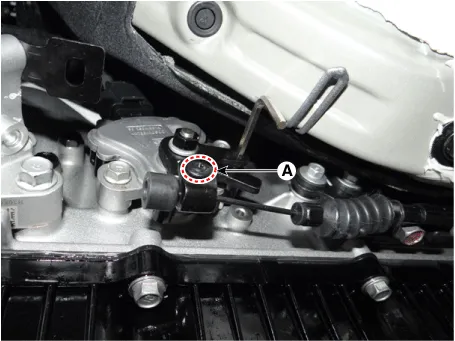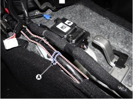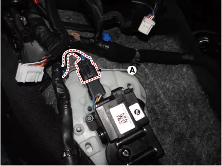 Disconnect the parking release actuator connector (A). Then, remove the cable by pulling it toward the vehicle interior.