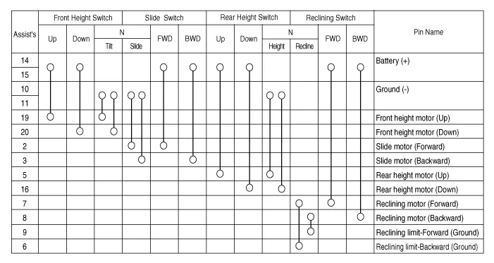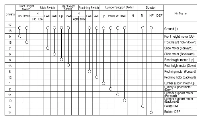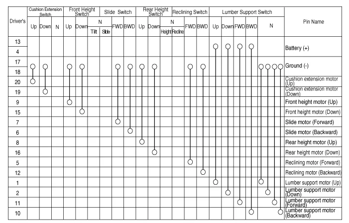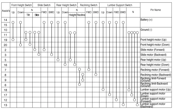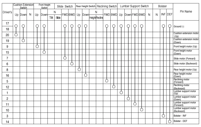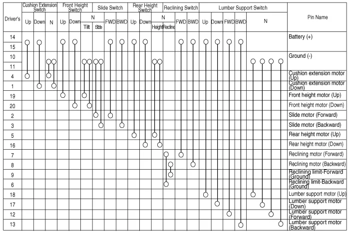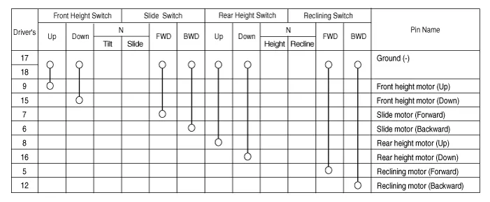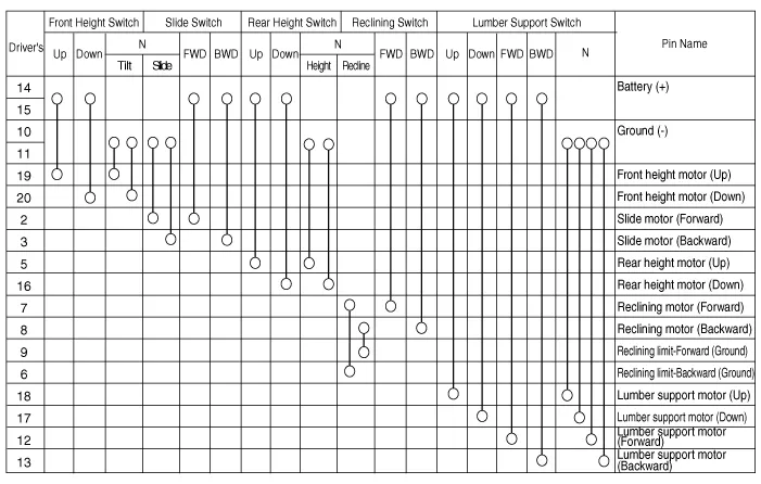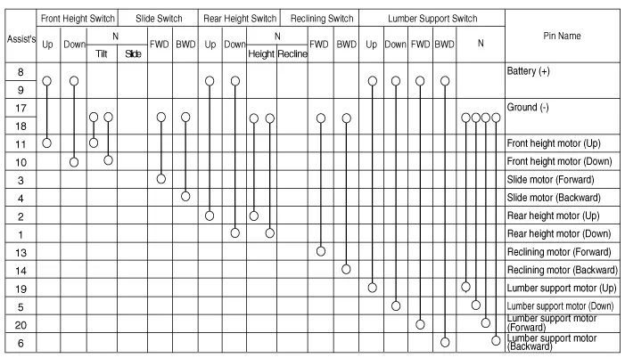 With the power seat switch in each position, make sure that continuity exists between the terminals below. If continuity is not as specified, replace the power seat switch.