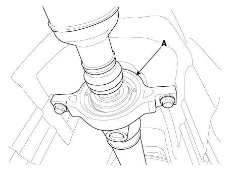Check the center bearing (A) for excessive play or rattle and rubber for rent. If the center bearing has excessive play or rattle and rubber has rent, replace the propeller shaft assembly.