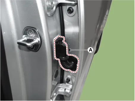 Remove the rear door latch (B) after disconnecting the latch connector (A).