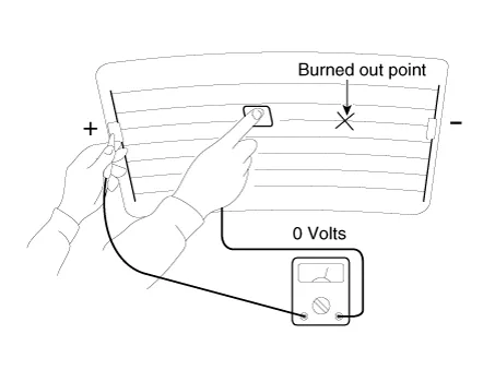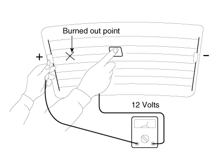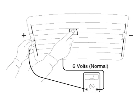 Turn on the defogger switch and use a voltmeter to measure the voltage of each heater line in the central part of the glass. If the voltmeter indicates 6V for a conductive line, the line of the rear window is considered to be in good condition.