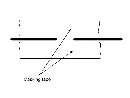 Using a thin brush : Wipe the glass adjacent to the broken heater line, clean with silicone remover and attach the masking tape as shown. Shake the conductive paint container well, and apply three coats with a brush at intervals of about 15 minutes apart. Remove the tape and allow sufficient time for drying before applying power. For a better finish, scrape away excess paint with a knife after the paint has completely dried. (Allow 24 hours).