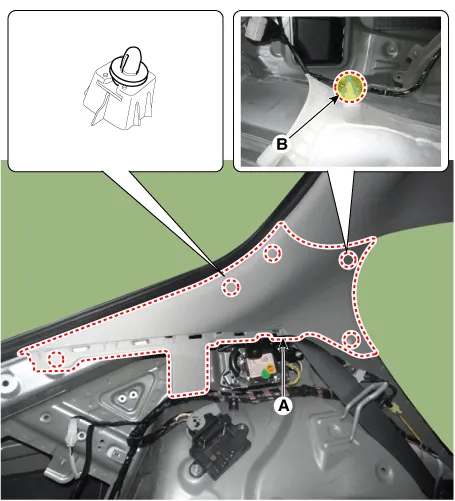 Remove the luggage side trim after disconnecting the luggage lamp connector (A).
