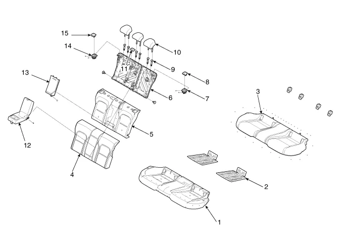 10. Rear seat headrest 11. Rear seat center belt cover 12. Rear seat armrest 13. Rear seat armrest back board 14. Rear seat back folding knob [RH] 15. Rear seat back folding knob cover [RH] |