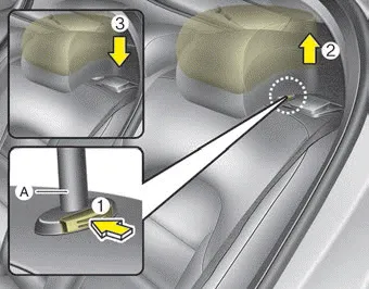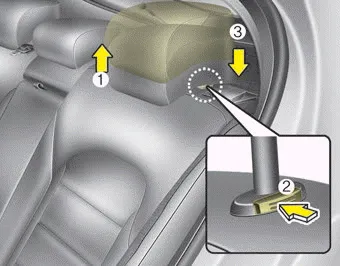 To raise the headrest, pull it up to the desired position (1). To lower the headrest, push and hold the release button (2) on the headrest support and lower the headrest to the desired position (3).