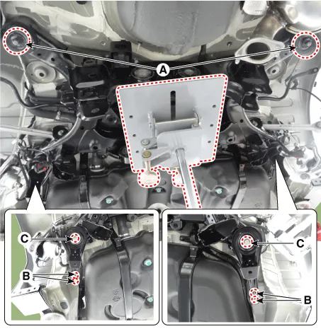 Loosen the rear cross member nuts & bolts and then remove the rear cross member.