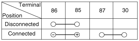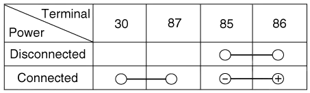 After supplying power to between No. 85 and 86 power relay terminals, check that there is continuity between No. 30 and 87 terminals. |