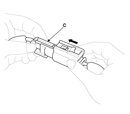 Hold both connector halves and press firmly until the projection (C) of the sleeve-side connector clicks to lock.