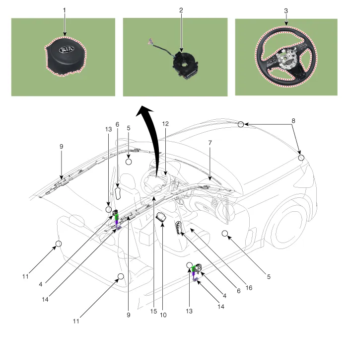 | 1. Driver Airbag (DAB) 2. Clock Spring 3. Steering Wheel 4. Seat Belt Pretensioner (BPT) 5. Pressure Side Impact Sensor (P-SIS) 6. Side Airbag (SAB) 7. Passenger Airbag (PAB) 8. Front impact sensor (FIS) |