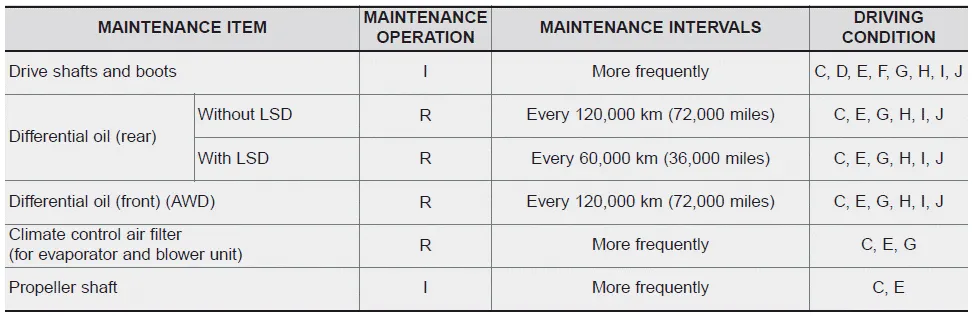 The following items must be serviced more frequently on cars normally used under severe driving conditions. Refer to the chart below for the appropriate maintenance intervals.