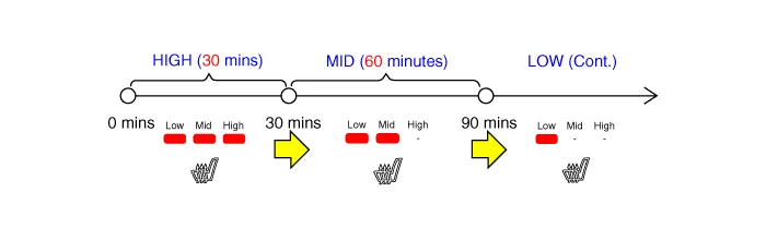 Change to "MID" after 30 minutes in "HIGH", then "LOW" after 60 minutes in "MID" |