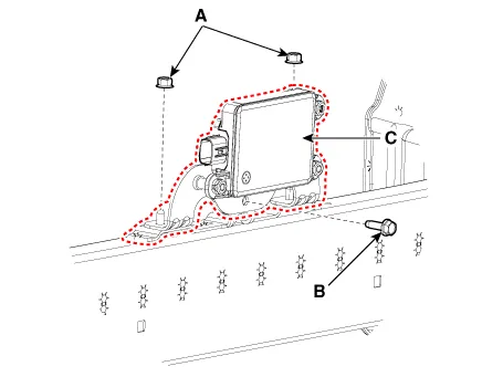 Loosen the front radar nuts (A) and bolt (B) and then remove the front radar (C).