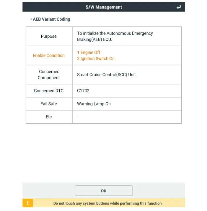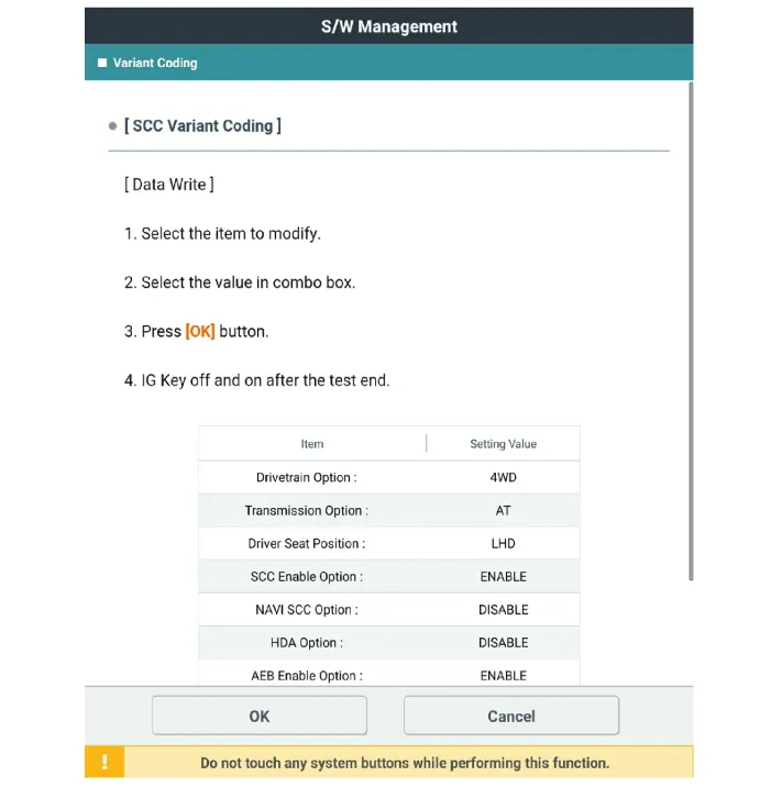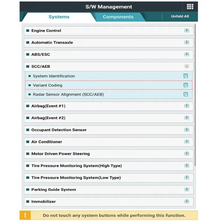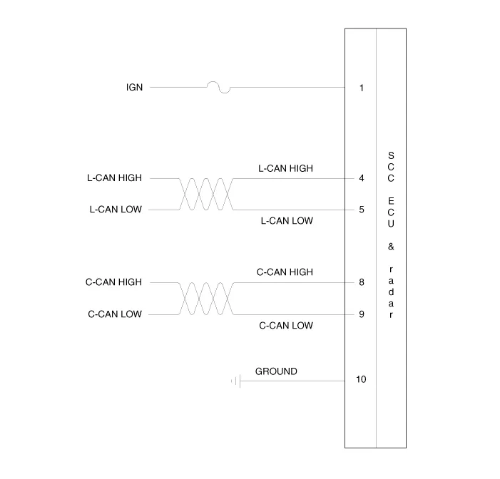 The smart cruise control unit is installed on the front right-hand side of the chassis. A radar sensor is embedded in the front section of the unit. This sensor detects vehicles and objects in front of the vehicle. The radar sensor can detect up to 64 objects ahead of the vehicle. The alarm goes off when the vehicle deviates from the horizontal and vertical alignment reference points during operation. This sensor communicates with the dashboard, warning buzzer, smart cruise control switch, Electronic Stability Program (ESP), ECM, and TCM via CAN communication. The sensor controls vehicle speed through CAN communication between the Electronic Stability Program (ESP) system and the ECM and TCM.