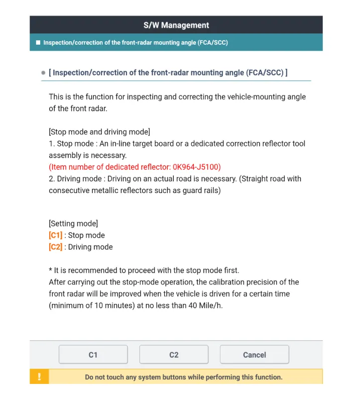 Select C1 (stop mode) to inspect and adjust the front radar installation