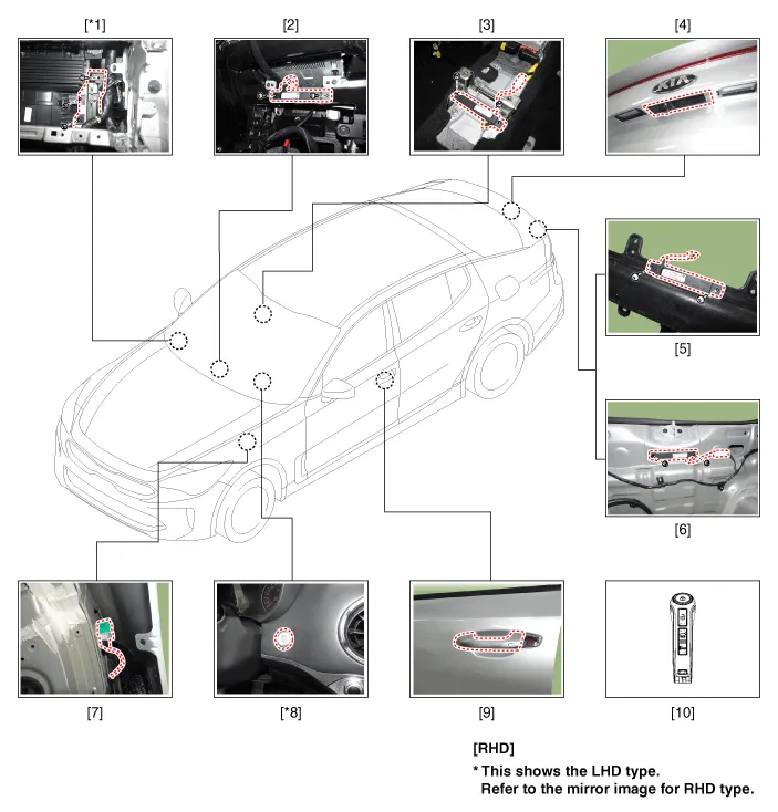 6. Tailgate antenna 7. Buzzer 8. Start Stop Button (SSB) 9. Door handle & door antenna 10. FOB key |