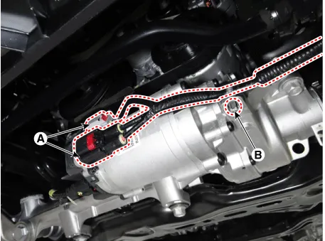 Disconnect the R-MDPS connector (A) and clip (B). [LHD]