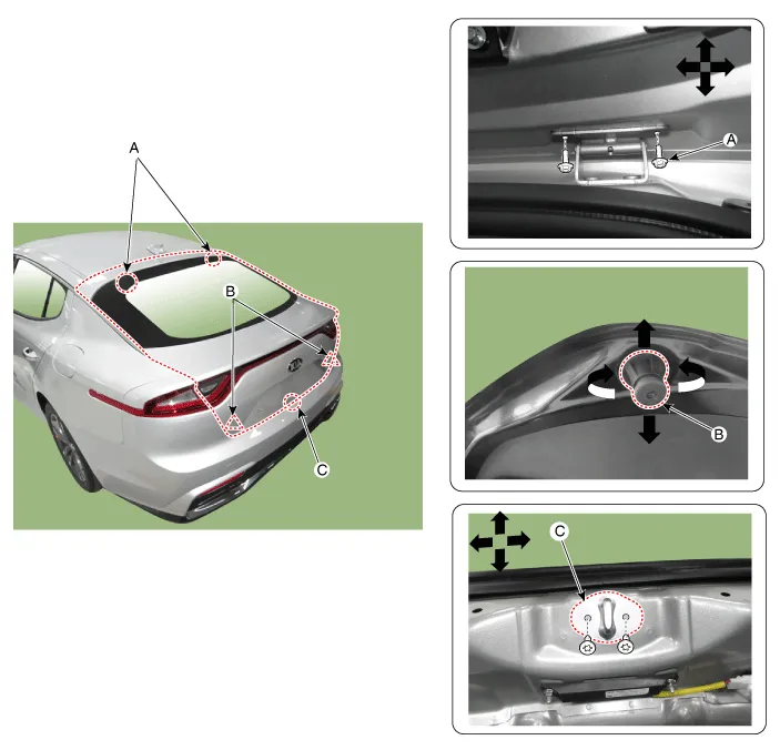 After loosening the tailgate striker (C) mounting bolts, adjust the tailgate striker by moving it up and down, or right and left.