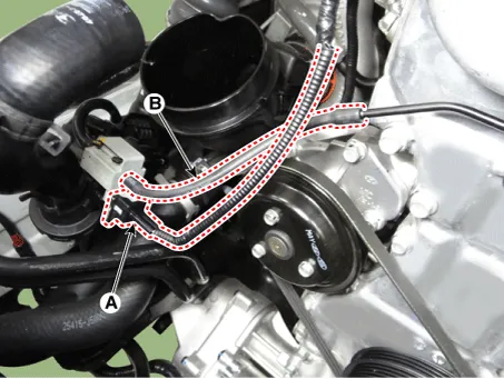 Disconnect the recirculation valve connector (A) and the vacuum hose (B).