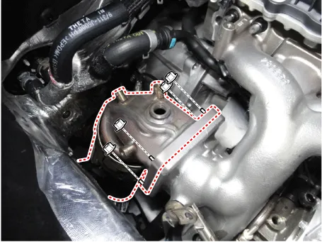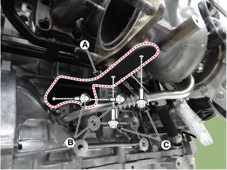 2. Turbo manifold module gasket 3. Heat protector 4. Warm-up catalytic converter (WCC) heat protector 5. Oil feed pipe 6. Turbo manifold module stay |