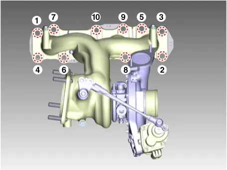If a gas leak occur as a gasket was not installed or mounting bolts (or nuts) were tightened inadequately, it may cause abnormal engine noise. If the cause of the problem is detected, retighten the mounting bolts (or nuts) as the specified torque or replace the gasket or damaged parts with new ones if necessary. |