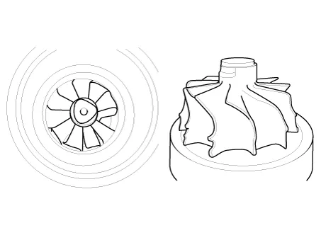 If the turbine wheel are damaged, it may cause abnormal noise from the turbocharger and poor acceleration. If the turbine wheel are damaged or deformed, replace the turbocharger with new ones. |